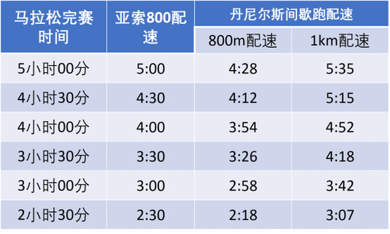 以3分30秒完成每组800米跑,那么最终马拉松完赛成绩将是3小时30分钟,如果800米每组成绩是3分钟,那么全马成绩将是3小时。