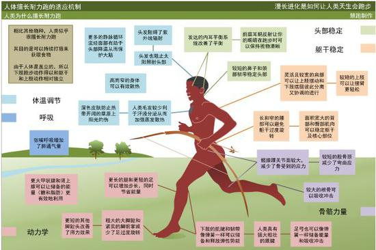 人类本质是一种耐力性动物,我们的祖先为了捕获猎物或者逃避凶猛野兽的追捕,奔跑几乎是唯一的有效办法,比我们跑得快的动物我们追不上,只有速度跟我们相仿的动物,我们可以凭借耐力将动物拖垮进而捕捉,比如野兔。当然,人类运用智慧合理捕捉比我们强大的野兽这是另外一回事。因此,人类在进化过程中形成了比较强大耐力,下图显示了漫长的精华是如何让人类天生会跑步的。
