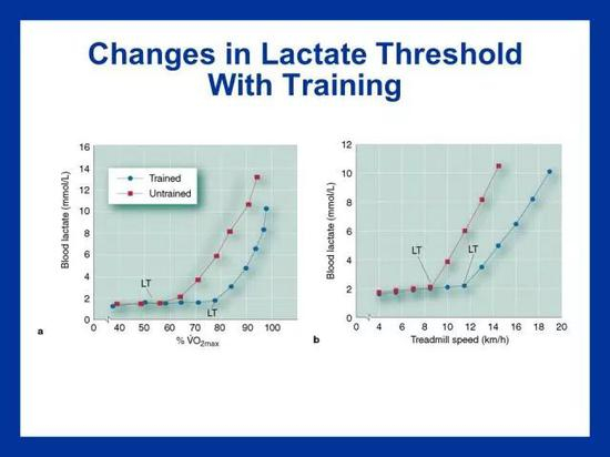 如下图所示,通过训练,跑者能够提升乳酸阈(LT)所对应的运动强度,比如原来6:00配速就是乳酸阈强度,而经过训练,6:00配速已经变成有氧运动,5:30配速才是乳酸阈强度,这就表明耐力得到实实在在的提高。话句话说,一位跑者本来以6:00配速进行跑步,身体会感觉很酸胀很难受,而通过一段时间的训练后,以6:00配速跑步会觉得很轻松,原本6:00时的酸胀感到了5:30才会产生同样的感觉。