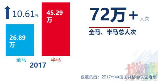 根据果动科技公布的2017年中国马拉松大数据分析报告,2017年,我国全马完赛人次为26.89万人次,半马完赛人次为45.29万人次,考虑到这个数字统计的是完赛人次,有一定比例的跑者一年不止参加一场赛事,如果一名跑者2017年全年参加了2场赛事,那么在这个统计中就是记为2人次。同时还有一些跑者一年中既会参加全马赛事,也会参加半马赛事,那么这些跑者既会对全马完赛人次做贡献,也会对半马完赛人次做贡献。