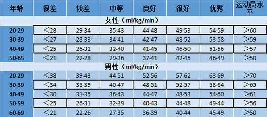 下表是美国运动医学会最大摄氧量评价标准,如果你了解自己的最大摄氧量,可以进行一下评估。一些运动手表也提供评估。