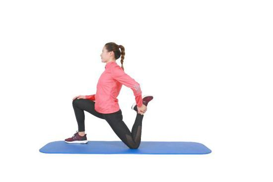大腿前侧拉伸采用卧姿往往拉伸感不是很强烈,采用跪姿牵拉感则十分充分。