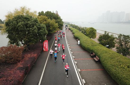 2019年12月26日,长沙红色半程马拉松在长沙市橘子洲景区开跑,参赛选手在比赛中。(无人机拍摄)新华社发(陈振海摄)