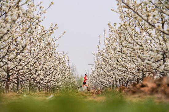2019年4月4日,选手在梨花盛开的赛道上奔跑。当日,河北省邢台市威县举办花海马拉松比赛,1000余名选手在万亩梨花中完成比赛。新华社记者邢广利摄