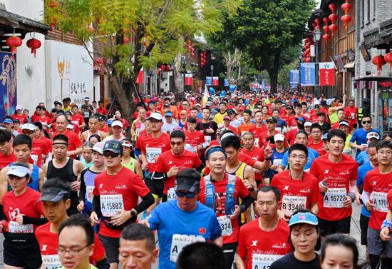 2019年12月15日,福州国际马拉松在福建省福州市五一广场鸣枪开跑。参赛选手在比赛中跑过福州三坊七巷。新华社记者林善传摄