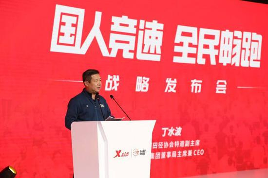 中国田径协会特邀副主席、特步集团董事局主席兼CEO丁水波在“国人竞速 全民畅跑”发布会现场发言。图据主办方