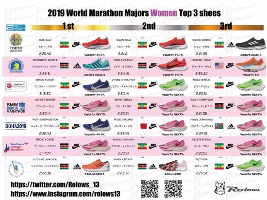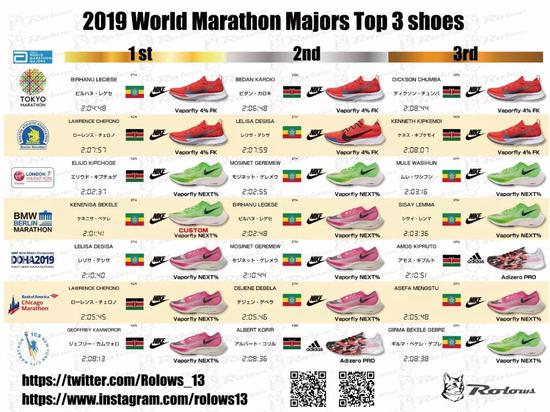 来看下这两年世界六大满贯马拉松赛上,男女前三名所穿的竞速跑鞋,如果说2018年VaporFly系列跑鞋算是占尽优势的话,那么到了2019年几乎是到了全垄断的地位,满屏的都是Next%。