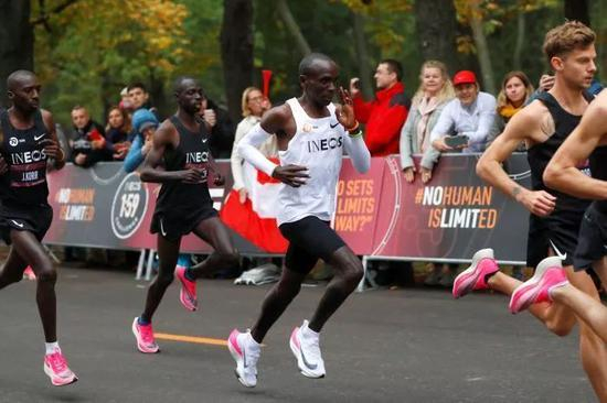 而碳板跑鞋最先引起人们的关注,是始于2017年的Breaking 2挑战,基普乔格穿着耐克旗下首款碳板跑鞋VaporFly Elite跑出2小时25秒的成绩,引起一片哗然,从此碳板跑鞋进入我们的视野。