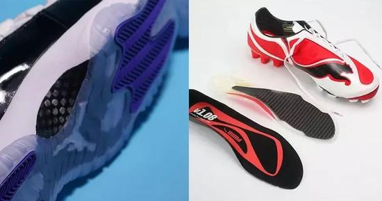 之后碳板被用到了篮球鞋和足球鞋中,用以防止球员在急停急转、急加速、变向等动作下出现受伤,起到稳固鞋身、足弓支撑抗扭转的作用。
