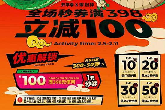 安踏推出名为“开学季×聚划算”的活动,天猫店内消费满398元减免100元,同时还有更多叠加优惠券派发。