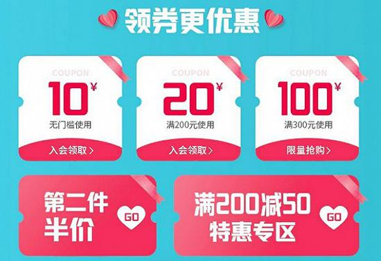 361°结合情人节购物季的优惠活动则更有“诚意”——全场消费满300减100,此外第二件半价。