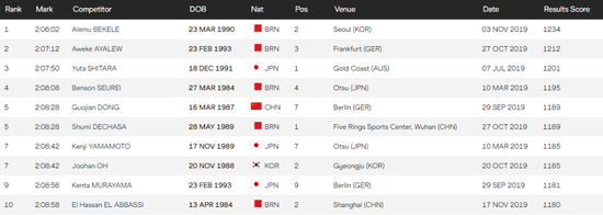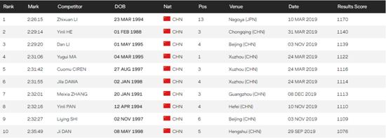 本篇用于盘点2019年中国马拉松及半程马拉松项目中成绩最佳的前10位选手,并横向对比这些国内选手在亚洲范围乃至世界舞台的整体水准;数据源自世界田径官方——