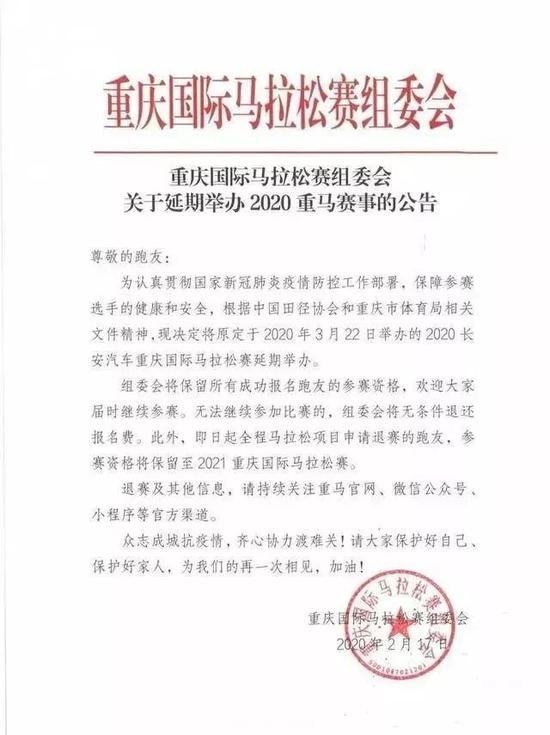 重庆马拉松(原定于3月22日举办),2月17日宣布延期;
