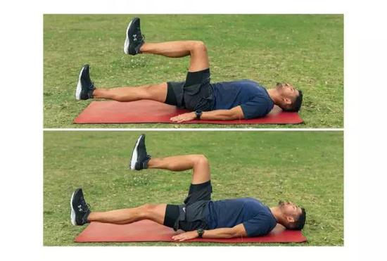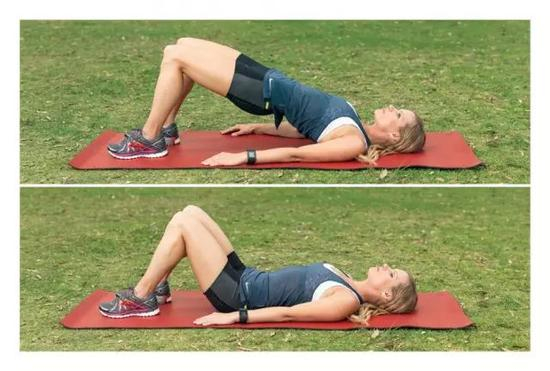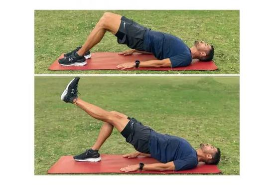 动作要领:平躺在地面,将臀部抬起,保持这个姿势30-60秒。加大难度:抬起一条腿。