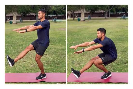 动作要领:下蹲的动作要慢一些,两条腿的膝盖不能碰到,不要弓背。每条腿做5-10次。