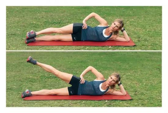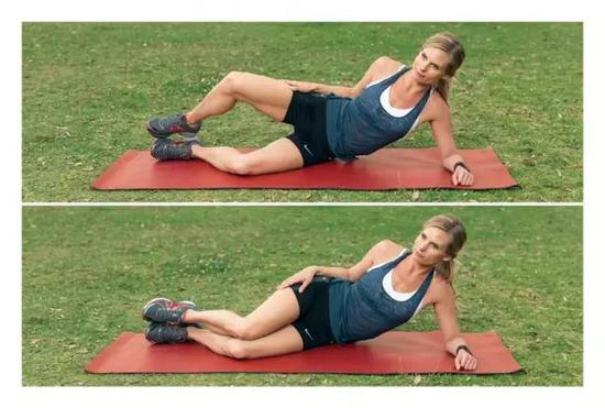 动作要领:侧躺时上身被手肘撑起,双腿自然弯曲,双膝一开一合,像蚌壳,双脚始终贴合在一起。每个侧面做20-30次。
