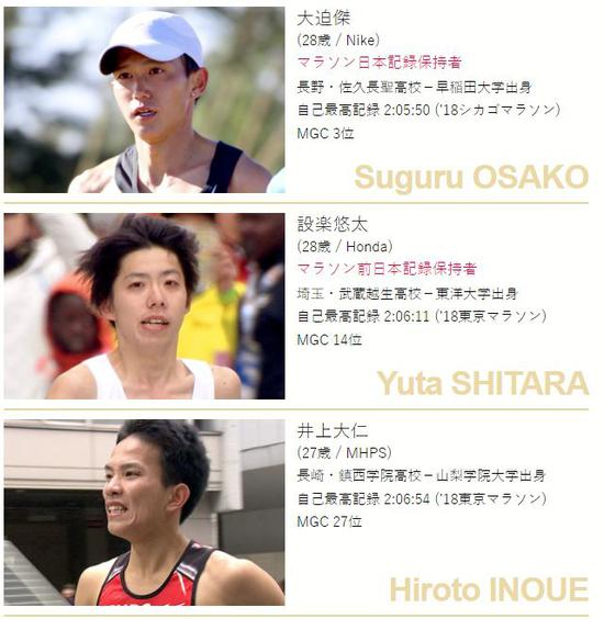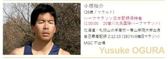 参加本次比赛的还有在2月2日创造1小时整日本男子半马纪录的小椋裕介(Ogura Yusuke),虽然他的马拉松最好成绩仅2:12:10,都没有参加去年的MGC,但现在状态爆棚的他,黑马潜质表露无疑。