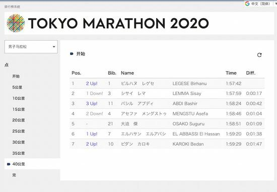 40公里, Legese独自领先,大迫杰1小时58分51秒,破自己的全国纪录已五悬念。