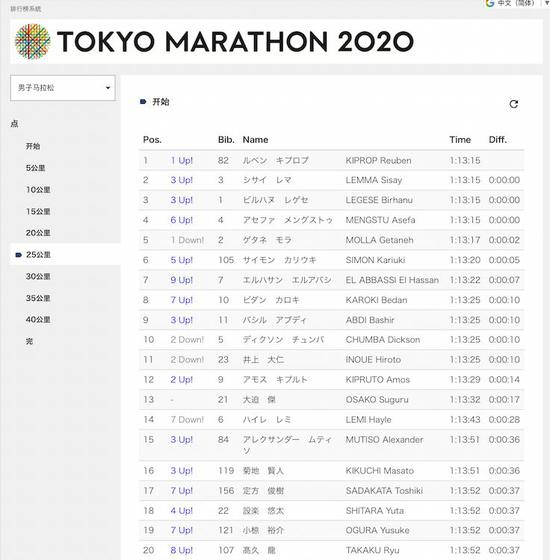 半程过后,第一集团稍微有些提速,大迫杰开始掉到队尾,到达25公里时,日本第一的井上大仁落后第一集团10秒,大迫杰落后17秒。