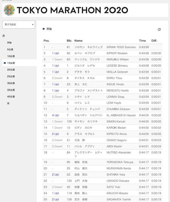 15公里,卫冕冠军Legese紧跟在三个兔子后面,保持了2分55秒的配速。去年的柏林马拉松,他被贝克勒反超,但还是创造了2:02:48的好成绩,今天志在打破东马赛道纪录。
