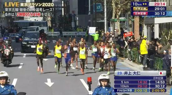 今天开跑后,井上大仁表现很强势,他紧紧跟随第一集团,第一个5公里用时14分32秒,10公里用了29分12秒,比日本纪录快了1分钟。