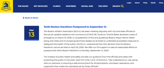 “鉴于马萨诸塞州州长查理·贝克已经宣布进入紧急状态,同时考虑到波士顿市长马蒂·沃尔强调必须采取一切手段在方方面面保证市民的健康和安全。组委会已经清楚认识到,波士顿这座城市无法在4月20日举行马拉松赛事,不得不做出延期的决定。”