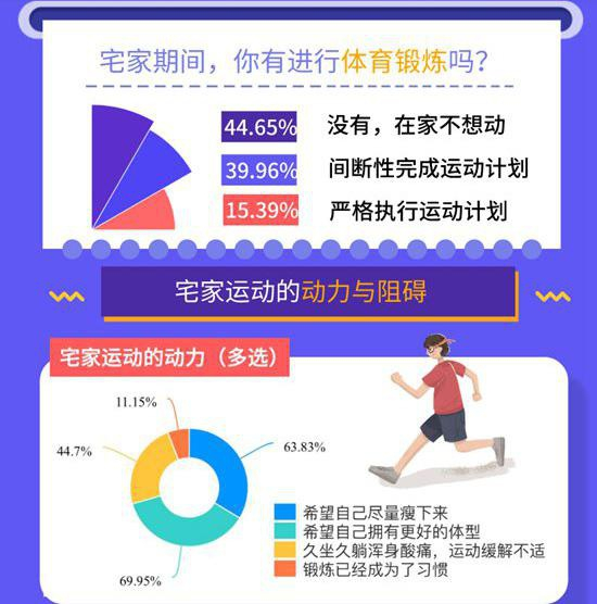 近日,中青校媒面向全国915名高校学生发起关于“宅家运动”情况的调查,发现15.39%被调查者在家期间会严格执行锻炼计划,39.96%选择间歇性完成制定的运动目标,还有44.65%在家很少运动。