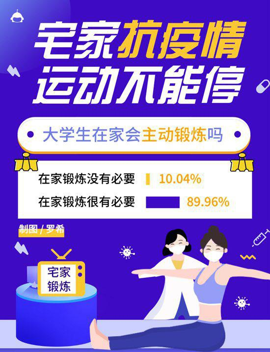 中青校媒调查结果显示,89.96%的受访大学生认为在家运动很有必要,希望通过运动达到减脂(63.72%)、塑形(69.95%)和缓解身体不适(44.59%)的目的。