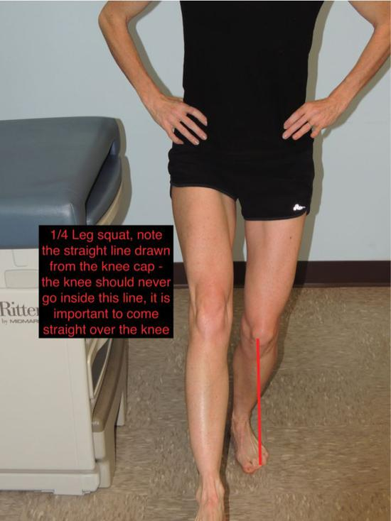 单腿站立,支撑腿做1/4下蹲,注意膝盖不要内扣或者外展。想象自己要坐下,但臀部没有接触椅子的情形。每条腿下蹲20-30次。