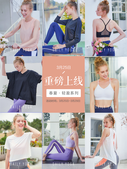 3月,专注瑜伽领域的综合瑜伽服务平台——每日瑜伽在APP商城及天猫“dailyyoga旗舰店”推出2020春季新款瑜伽服系列,该系列瑜伽服款式新颖,风格清新简约,是独立自信、热爱生活的女性练习瑜伽时的最佳拍档。本季瑜伽服将于本年度3、4月份分批次上新,涵盖运动Bra、运动背心、短袖、罩衫、长袖、七分裤、九分裤等全面款式,每一款式均由瑜伽名师亲自试穿反馈,更贴合瑜伽练习需求。