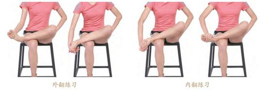 采用坐姿,握住脚外侧,手给予脚向上的阻力,脚踝做向下发力动作即是外翻练习。重复16次为一组,做2~3 组。