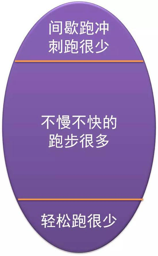 但事实上,很多跑者,哪怕是资深跑者,训练模式却是纺锤形模式,什么叫纺锤形训练模式?意思是指很多跑者平时很少做间歇跑、冲刺跑这类速度很快的训练,而速度较慢的轻松跑也不屑于训练,他们的训练多数是不慢不快地跑步。这种训练方式带来的问题就是尽管训练不轻松,但能力提高缓慢,成绩停滞不前,还因为训练太过单调而容易受伤。