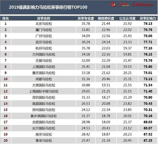 昨天下午,人民网发布了2019最具影响力马拉松赛事排行榜TOP100,评选围绕“赛事专业度”、“媒体辨识度”、“公众认可度”三个一级指标进行考量,设置二级、三级指标30余项。