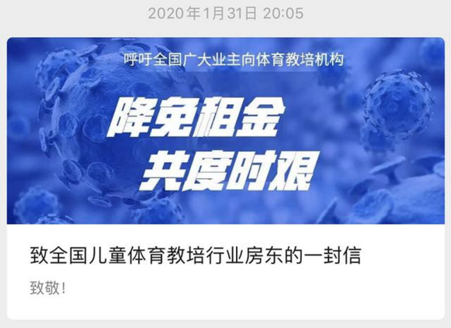 在这样一个情况下,全国整个线下教培行业其实都将面临租金高昂,没有营收,现金流断裂的难题。覆巢之下,焉有完卵,为了保护全行业的健康发展,兔+熊还发布了《致全国儿童体育教培行业房东的一封信》,向广大业主请愿酌情减免疫情防控期间的部分租金。