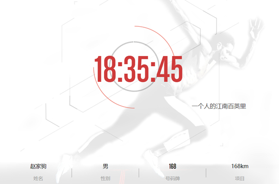 此时耗时11小时35分20秒,完成里程110.2公里,即赵家驹若在接下来的10小时25分钟时间里完成后面的58公里路程,那么便能打破2019江南百英里越野赛冠军林潇的赛道纪录。