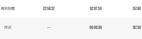 22:58分,计时系统显示赵家驹在CP蒋宋别墅打卡,整体赛程完成157.6公里,剩余10公里左右,总耗时17小时28分32秒。