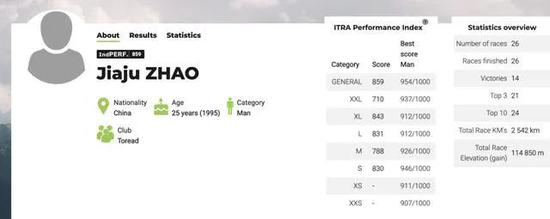 ITRA纪录数据显示,其目前一共参加ITRA认证赛事26场,取得前三名次者21场,夺取冠军场次更是高达14场。