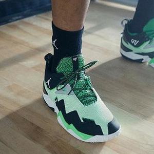 Jordan Westbrook One Take鞋面上采用不规则变化的迷彩绿色,织物材料与合成饰面的连接处采用显眼的针脚,拥有鲜明风格。