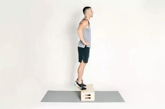 这项练习主要是拉伸和增强小腿肌肉。站在一个木箱上,双手放在腰间,脚后跟悬空,用脚尖支撑着身体平衡,身体保持直立。将脚后跟向上抬起,然后缓慢的下降,大约持续10秒钟,脚后跟降至木箱水平面以下。