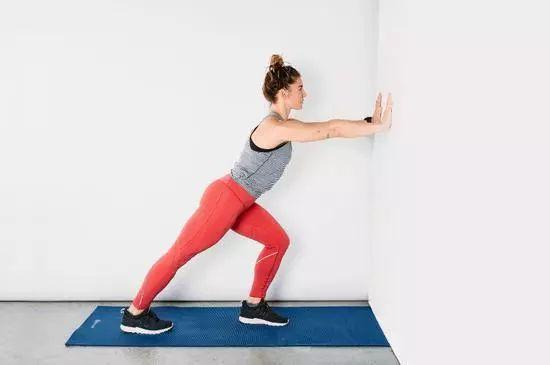 这项练习适合在跑后进行,可以减轻肌肉疼痛。面对一堵墙站立,双臂在身体前方伸直,双手完全贴着墙面。先将左腿向前迈一步,膝盖弯曲,脚贴着地面,然后将右腿向后方完全伸直,脚完全贴着地面,此时能感受到对右腿的拉伸。保持30秒之后,换左腿进行拉伸。