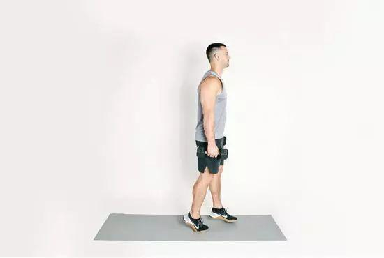 这项练习主要是增强小腿的肌肉力量。双手各握一只哑铃,双臂自然下垂位于身体两侧。将脚后跟抬起,用脚尖向前走路60秒钟。在此过程中,确保身体直立。这项训练不仅锻炼小腿,还有助于心血管健康。如果感到轻松,就加大哑铃的重量。