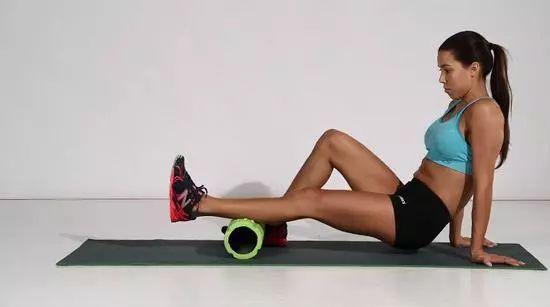这项练习适合在跑步结束后进行,缓解肌肉紧张,增强灵活性。坐在地面上,在左腿踝关节下方放置一个泡沫轴,右腿放在地面或者交叉放在左腿之上。双手在身体后方支撑着身体,臀部抬起离开地面,然后将泡沫轴在左腿的脚踝和膝盖之间来回滚动,15次之后换右腿进行练习。