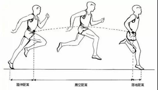 同样重要的还有我们的步幅。步幅为一步的距离,以脚的中心算。你走或跑一步后,两脚落地时中心的距离就是你的步幅。成人正常行走步幅大约在65厘米左右,而跑步时步幅更大,因为两脚落地之间往往还有腾空的距离,如下图,步幅=蹬伸距离+腾空距离+落地距离。