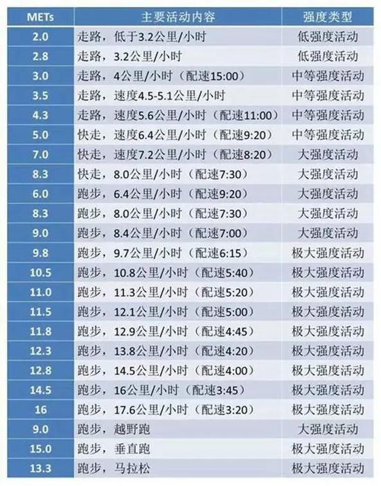 从下表中可以看到,普通步行(4-6公里/小时)都属于中等强度活动,快走(7.2公里/小时)已经是大强度活动。而只要是双脚离地的跑步,无论速度快慢,就是属于大强度活动。因为双脚离地意味着腾空,腾空就代表需要肌肉收缩克服体重做功,所以举例来说,6.4公里/小时的快走,MET值为5,属于中等强度活动,而6.4公里/小时的慢跑,MET值为6,已经属于大强度活动,跑得越快,当然强度越大,MET值越高。快在下表中找到你平时跑步配速所对应的MET水平吧~