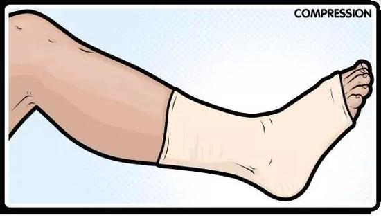 3。 Compression —— 加压。对相应部位进行加压包扎。用弹力绑带等工具进行压力包扎,对损伤部位有良好的消肿效果,还能对肌肉关节形成一定的支撑保护。