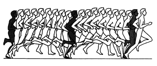 在每次双脚支撑转换中,悬空的腿都会折叠上拉到一定的高度,甚至有运动员后脚跟能踢到臀部。