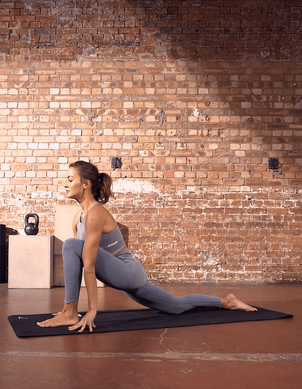 经典的鸽子姿势,带有独特的变化,从单腿向下的犬式移到鸽子姿势,可以在启动鸽子姿势姿势之前激活臀肌并伸展腘绳肌。
