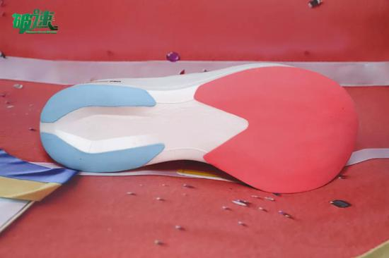 外底设计绝对是adizero adios Pro 的又一大亮点,它采用了一种轻便的橡胶,前掌全部进行覆盖,中足镂空,中底材料直接接触地面,后掌处只在高触地区域覆盖了橡胶。但整个鞋底没有进行任何橡胶纹路设计,看上去十分光滑,虽然橡胶能够做到止滑提供牵引力,但耐磨度要打上问号。