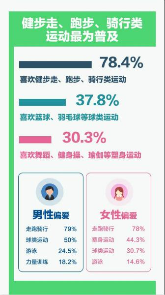 最受市民青睐的体育健身项目是健步走、跑步、骑行类运动。