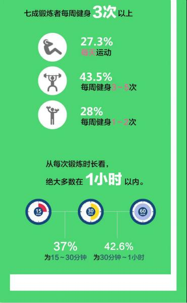 疫情期间坚持健身的市民中,27.3%每天运动,43.5%每周健身3~5次,28%每周健身1~2次,每周参与体育健身的平均频次为4次。其中60岁以上健身频率最高,52.9%每天进行体育锻炼。从每次锻炼时长看,绝大多数在1小时以内,其中42.6%为30分钟~1小时,37%为15~30分钟。